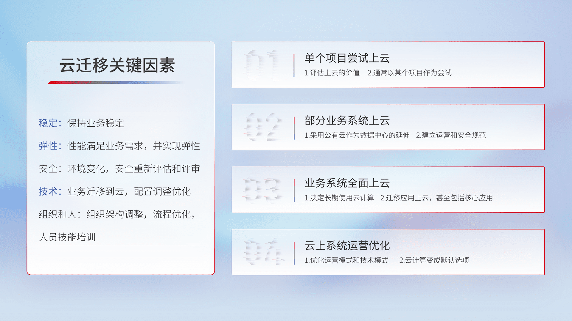 结合实际业务,,从规划设计、、、云平台选型、、云原生改造、、、数据迁移、、、集成交付,,迁移全过程为客户识别最佳上云路径,,,,做好风险识别管理,,,设计网络架构、、身份权限、、、安全审计合规、、、、操作审计、、日志审计、、、监控告警策略、、、多站点容灾设计等,,对云上基础设施进行整体规划,,,提升IT治理水平,,,以满足弹性、、、、高可用、、、、高性能的需求。。