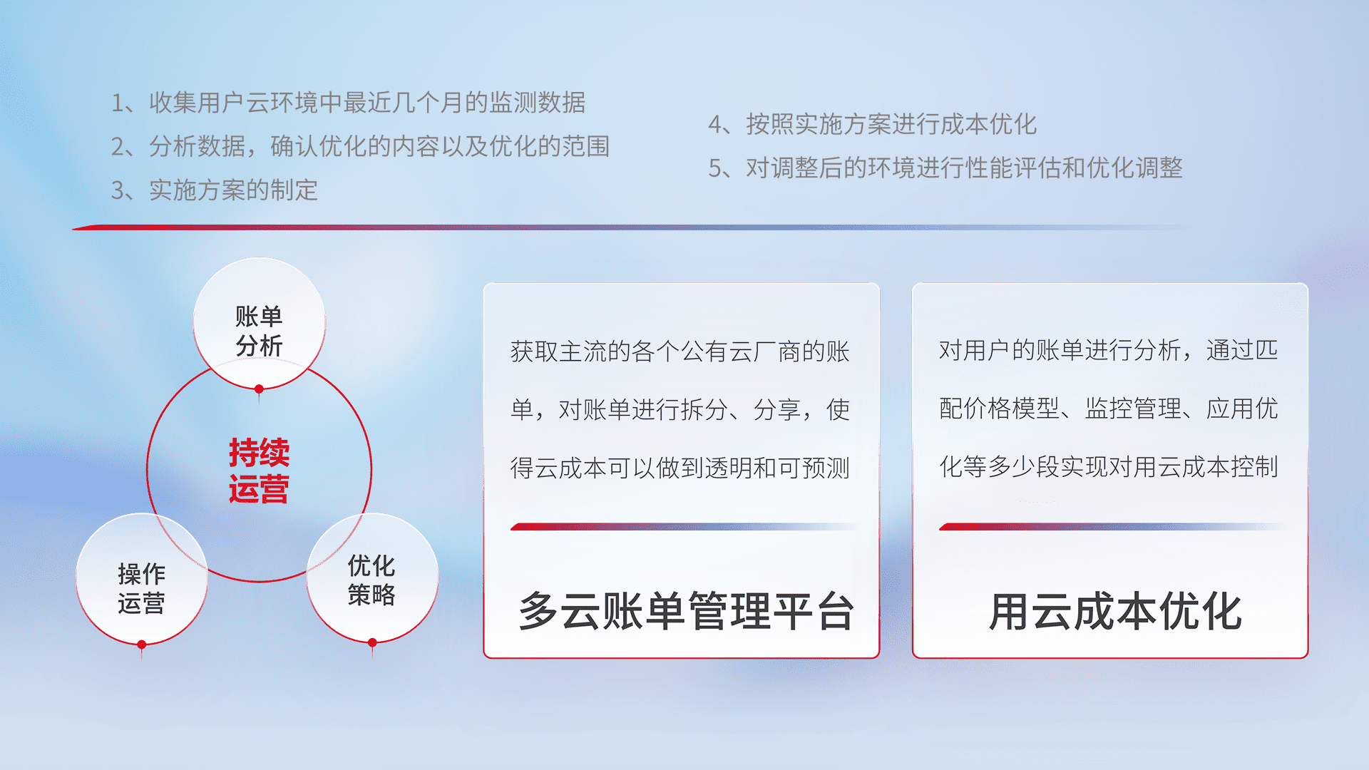 通过多云纳管,,以统一的资源数据模型把客户的云资源进行抽象和封装,,进而实现对多云资源的统一操作,,,保障云资源管理的可靠性、、稳定性与可用性。。。量身定制化运维内容,,,,配置、、、、开发运维、、补丁管理、、备份、、、、监控、、、、认证和访问管理、、、、审计和日常巡检等,,,保障在用云过程中的可靠度,,,,稳定度以及高可用率。。。